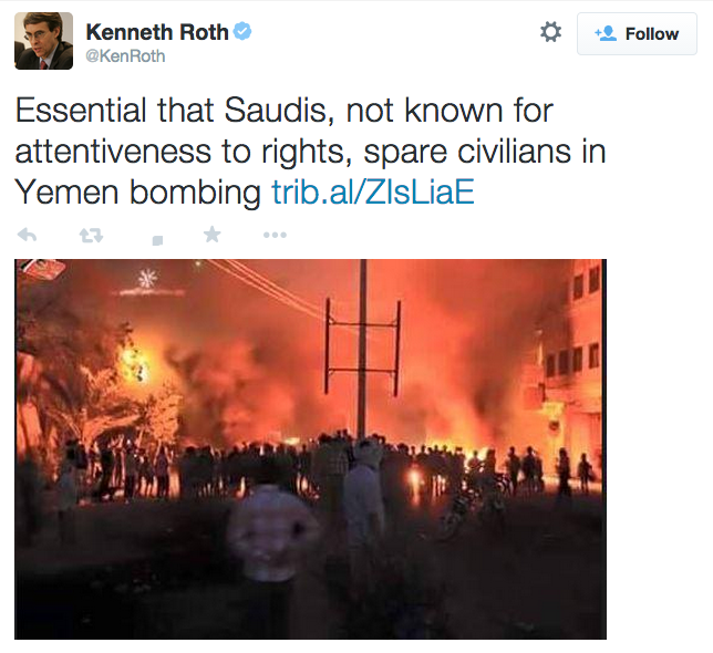 100% Grade A Liberalism(Head of Human Rights Watch Suggests Saudi Arabia Spare Civilians in Unprovoked Bombing of Another Nation)