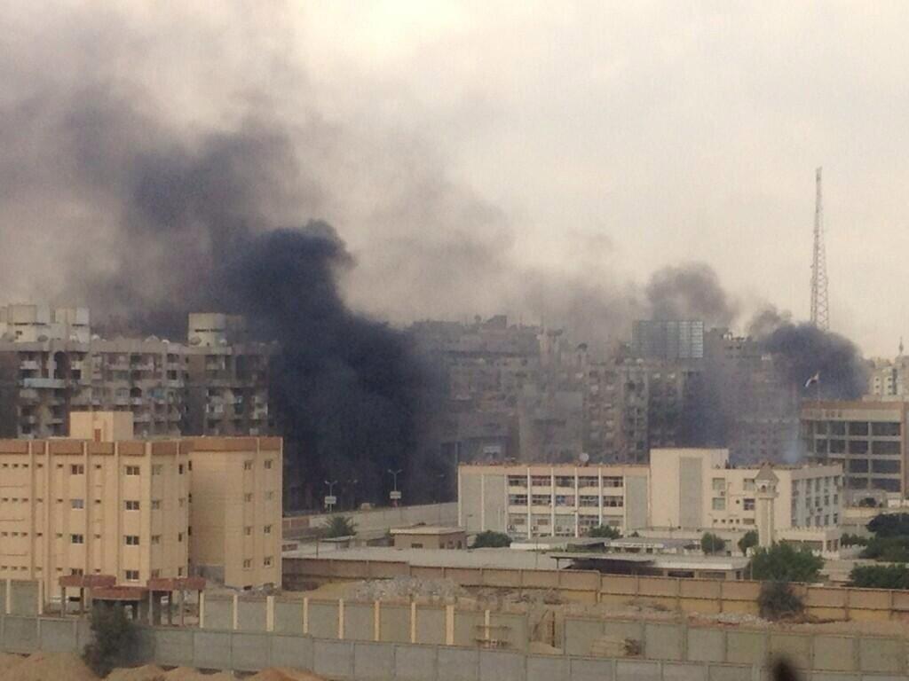 Smoke rises from anti-coup protest center in Rabaa. Police and Military slaughter pro-Morsi protesters.